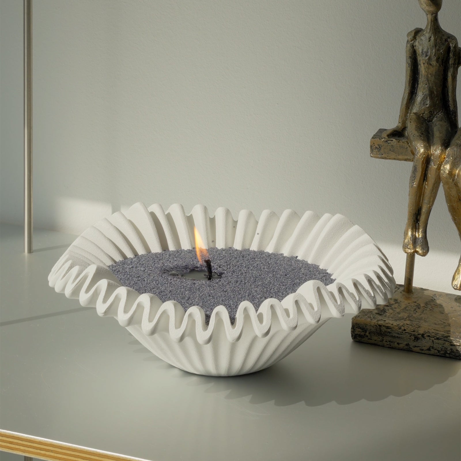 Voeg een subtiel designstatement toe aan je interieur met deze verfijnde schaal. Het elegante, geplooide design doet denken aan de zachte vormen van golven en creëert een speels, maar stijlvol effect. Met zijn tijdloze witte kleur past deze schaal moeiteloos in elk interieur en vormt hij een prachtige basis voor decoratieve accenten zoals kaarsenzand of kleine accessoires. Geschikt voor één lont, perfect om een sfeervolle kaars te creëren.