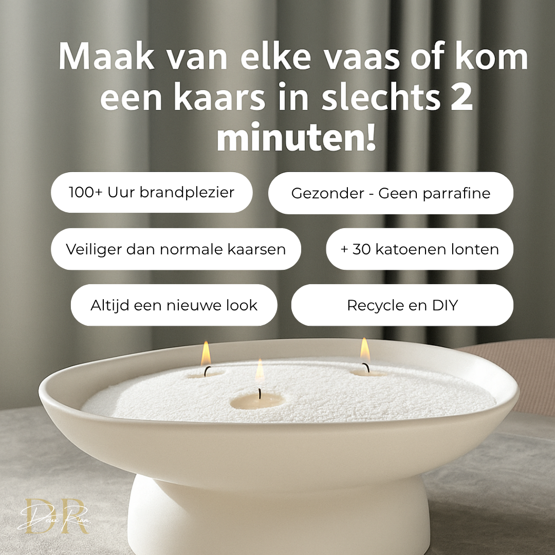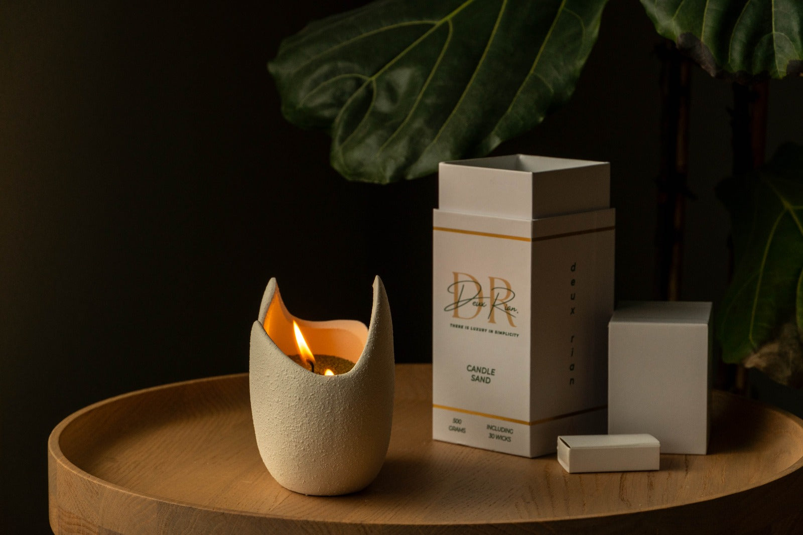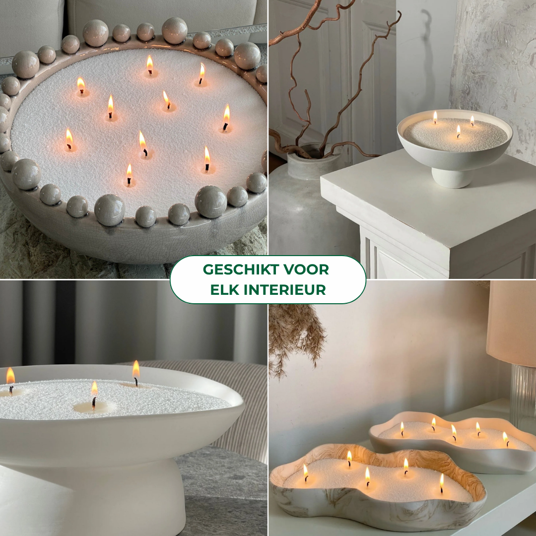 Kaarsenzand is een creatieve manier om je eigen kaarsen te maken. Vul een schaal, pot, vaas of andere decoratieve houder met zand, plaats een lont en steek deze aan. Na gebruik kun je het zand eenvoudig vernieuwen zodat je weer een gloednieuwe kaars hebt!