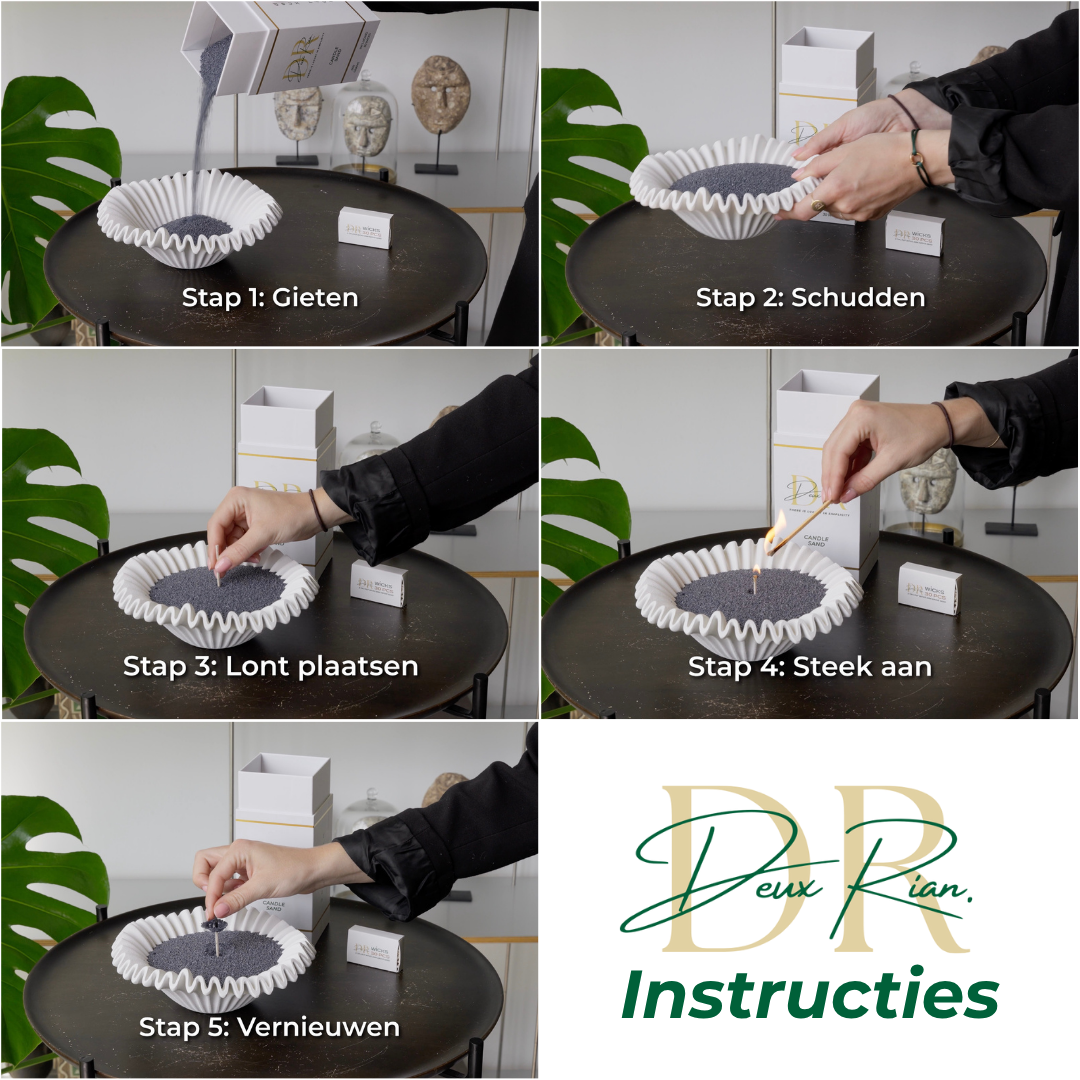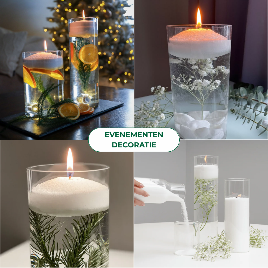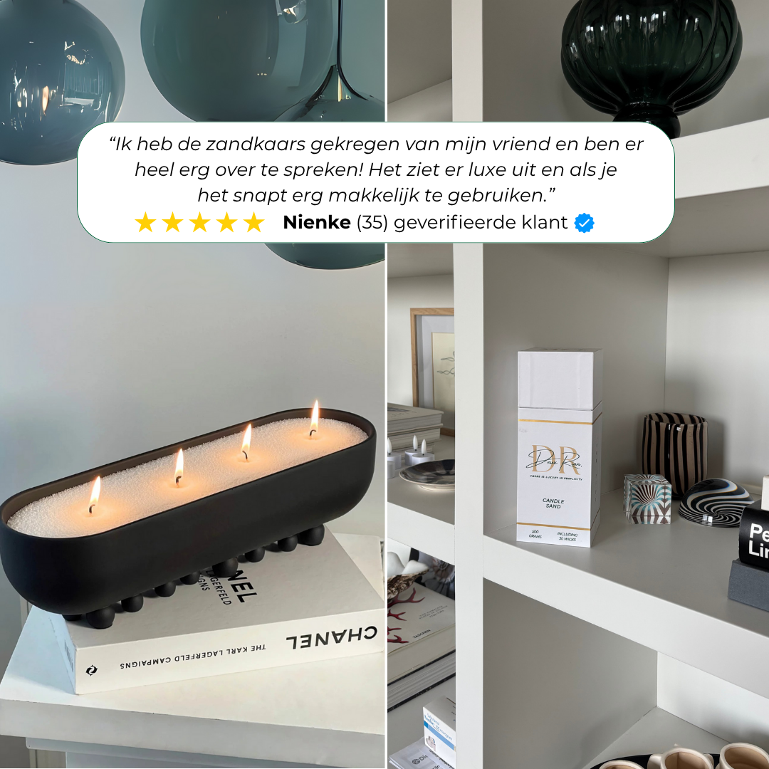 Kaarsenzand is een creatieve manier om je eigen kaarsen te maken. Vul een schaal, pot, vaas of andere decoratieve houder met zand, plaats een lont en steek deze aan. Na gebruik kun je het zand eenvoudig vernieuwen zodat je weer een gloednieuwe kaars hebt!